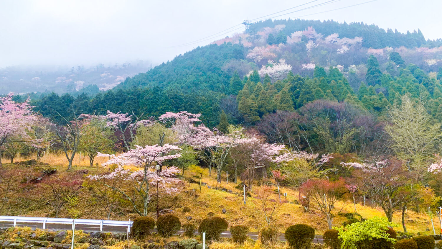 山の奥の斜面にもぽつぽつと桜が咲いていて、それが霧のヴェール越しに立体的に浮かんで見えるんですよね。写真に撮るとどうしても平面になっちゃうんですけど、実際に目で見ると、奥行き感が半端ない。