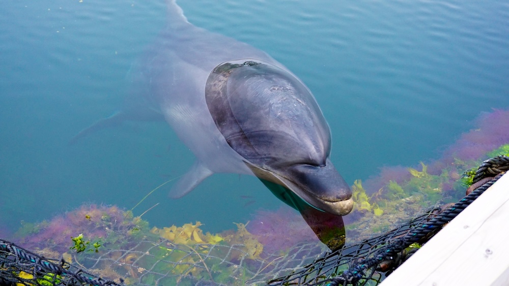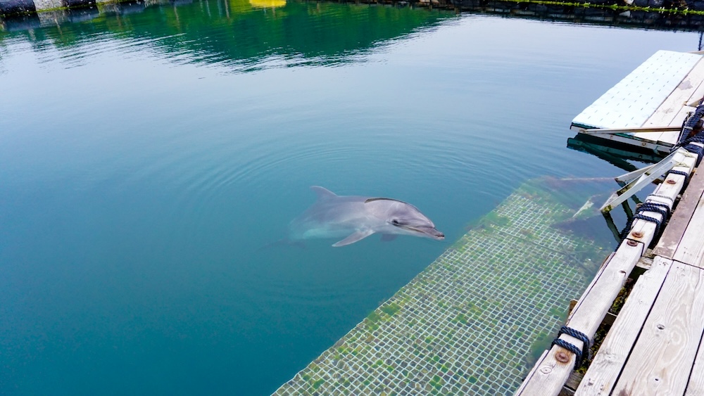 イルカのイケスに近づいてみると、すぐにイルカたちがスーッと寄ってきてくれました!本当に人懐っこくて、何度も顔を出してくれるんですよね。初めてこんなに近くでイルカを見たんですが、やっぱり可愛いなぁって実感しました。