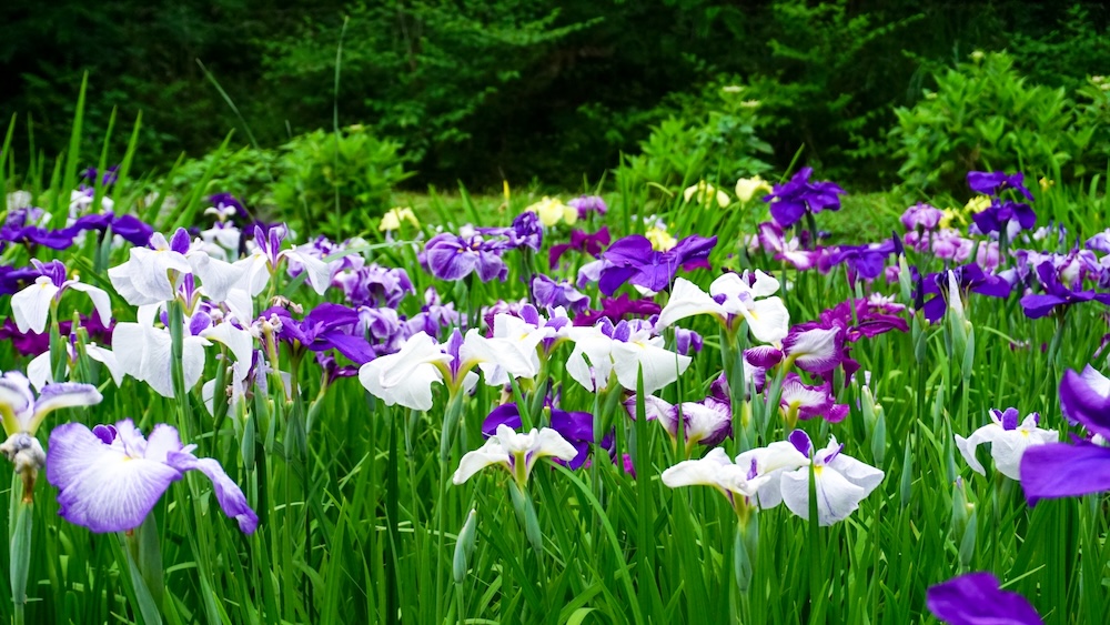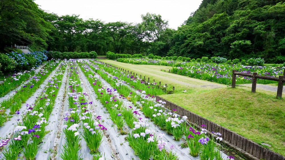 何列にも並んで咲いている菖蒲の花は、本当に圧巻でした。紫や白の花が整然と並んでいる様子は、まるで絵画のような美しさ。こんな素敵な場所が旅の途中で見つかるなんて、ラッキーでしたね。